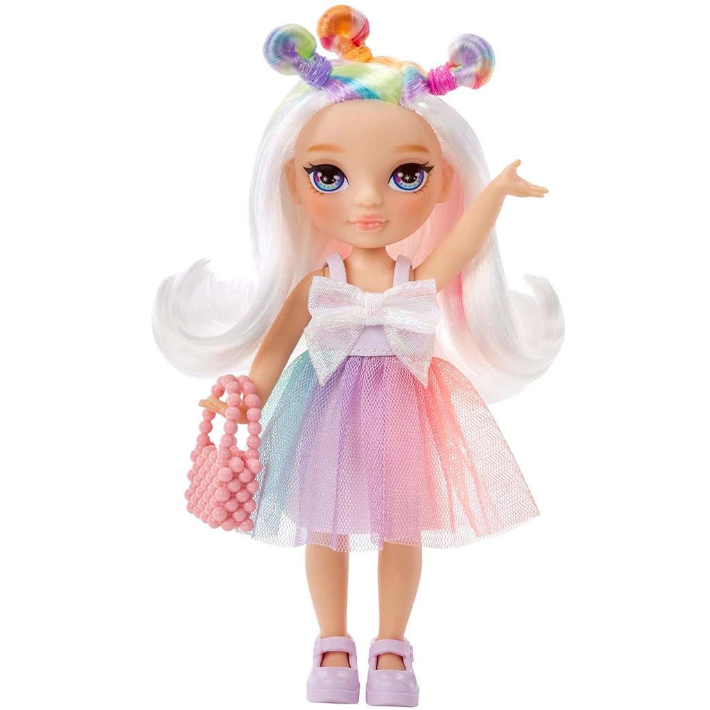 Opal Raine tiene su propio estilo único. Está en un vestido arcoíris con tela de tul suave y parte superior moldeada. Viene con zapatos de arcoíris a juego y un bolso. Ella tiene una adorable cara más joven esculpir y pelo largo y liso arco iris con tres lindos bollos arcoíris. Ella viene con un unicornio mágico súper lindo arco iris. Está articulada en la cabeza, los hombros y las piernas.